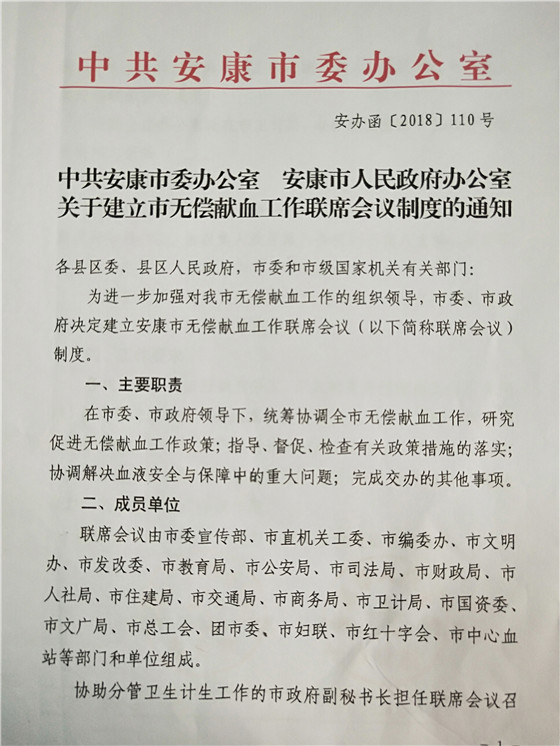 2、安康市率先在全省建立首個無償獻(xiàn)血聯(lián)系會議制度 安康無償獻(xiàn)血聯(lián)席會議制度是在安康市委、市政府領(lǐng)導(dǎo)下,由市委宣傳部等21個市級部門和單位組成,協(xié)助分管衛(wèi)生計生工作的市政府副秘書長擔(dān)任聯(lián)席會議召集人。聯(lián)席會議每年召開一次全體會議,主要職責(zé)為統(tǒng)籌協(xié)調(diào)全市無償獻(xiàn)血工作,研究促進(jìn)無償獻(xiàn)血工作相關(guān)政策,指導(dǎo)、督促、檢查有關(guān)政策措施的執(zhí)行落實,協(xié)調(diào)解決血液安全與保障中的重大問題。聯(lián)系會議制度的建立,標(biāo)志著我市無償獻(xiàn)血宣傳招募模式“政府主導(dǎo)、部門協(xié)作、社會參與、城鄉(xiāng)聯(lián)動”的發(fā)展格局和長效機制得到進(jìn)一步鞏固和提升。