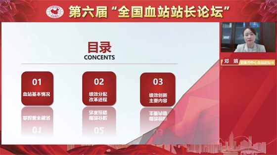 為加強全國血站的經驗交流與合作,2021年10月27日至28日,第六屆 “全國血站站長論壇”在深圳市舉辦。中國輸血協(xié)會理事長、世界衛(wèi)生組織輸血合作中心主任朱永明,深圳市衛(wèi)健委二級巡視員林漢城等相關領導出席并致辭。此次論壇的主題是“血站建設與發(fā)展、改革與創(chuàng)新”,來自全國各省、市血液中心(血站)的同仁通過線上方式參加會議。安康市中心血站副站長鄧娟作為全國血站六個優(yōu)秀論文交流發(fā)言人之一,就安康血站績效分配、改革與創(chuàng)新工作在會上進行了經驗交流。