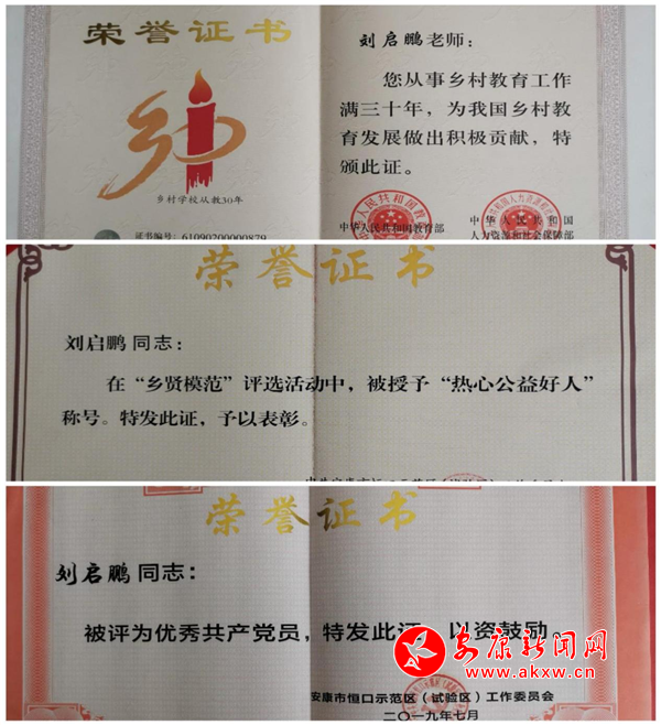 劉啟鵬先后獲得教育部、人力資源和社會保障部授予“鄉(xiāng)村學(xué)校從教30年”榮譽(yù)證書,被區(qū)鎮(zhèn)評為“鄉(xiāng)賢模范”和“優(yōu)秀共產(chǎn)黨員”等先進(jìn)個(gè)人。