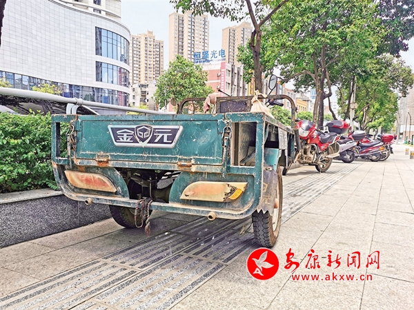 ?6月22日,安康城區(qū)江北江華公司消防通道被摩托車占用(圖1),這一區(qū)域的人行道盲道也被各種車輛侵占(圖2),存在安全隱患。(記者 潘潤生 攝)