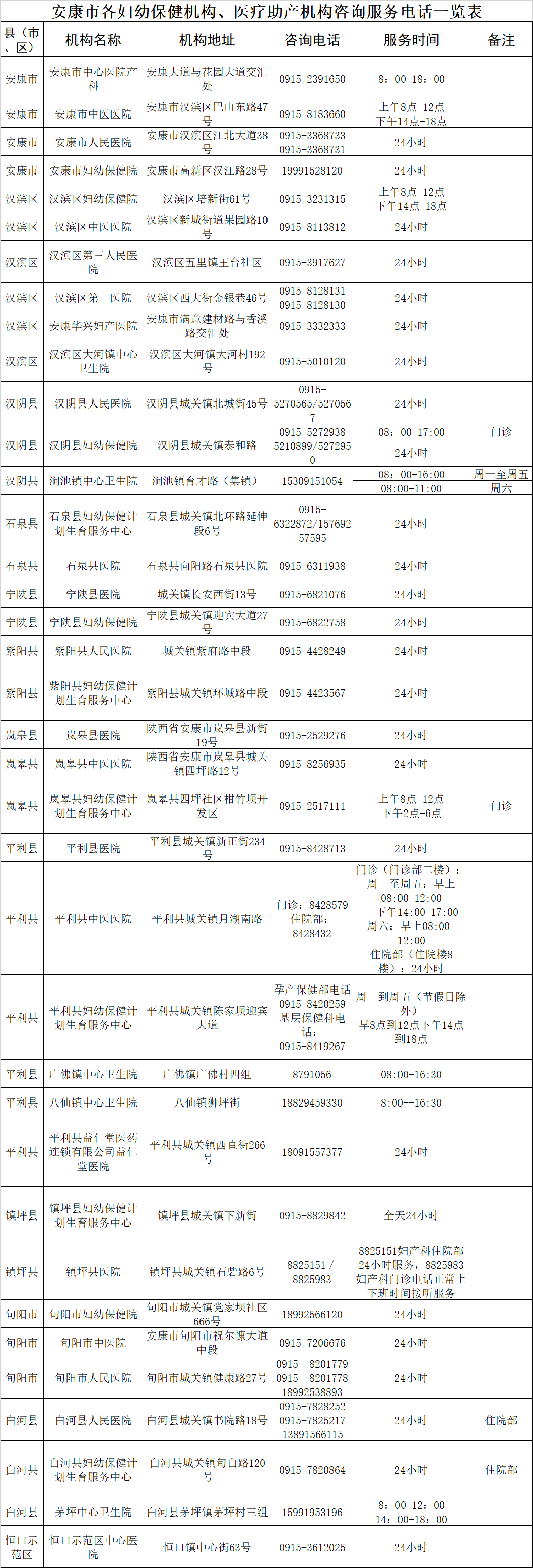 現(xiàn)將安康市各婦幼保健機構(gòu)、醫(yī)療助產(chǎn)機構(gòu)咨詢服務電話予以公布,望周知。