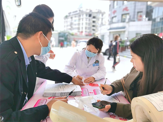 早上9點,列隊等候的醫(yī)務(wù)工作者們在獻(xiàn)血車前,井然有序的進(jìn)行信息登記、健康征詢、血壓測量等程序。他們中有多次獻(xiàn)血的“老兵”,也有首次獻(xiàn)血的年輕職工,有的剛下夜班,有的趁工作間隙,還有的則放棄了休息趕來。大家紛紛表示,無償獻(xiàn)血就是以實際行動踐行廣大醫(yī)護(hù)人員的初心使命,為老百姓的生命健康保駕護(hù)航。