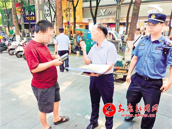 7月18日上午,漢濱城管執(zhí)法分局“‘痰’吐文雅,舉‘紙’得體”糾治組在金州路、白天鵝廣場以及公交車站附近巡查值守,對(duì)取證發(fā)現(xiàn)的隨地吐痰不文明行為進(jìn)行法規(guī)宣傳教育,并采取罰款、微信朋友圈發(fā)公益廣告集贊等形式給予糾治。李東 攝