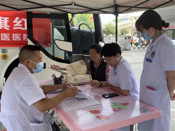 早上10點,醫(yī)務(wù)工作者們在獻(xiàn)血車前排隊等候,大家井然有序地進(jìn)行信息登記、健康征詢、血壓測量等程序。
