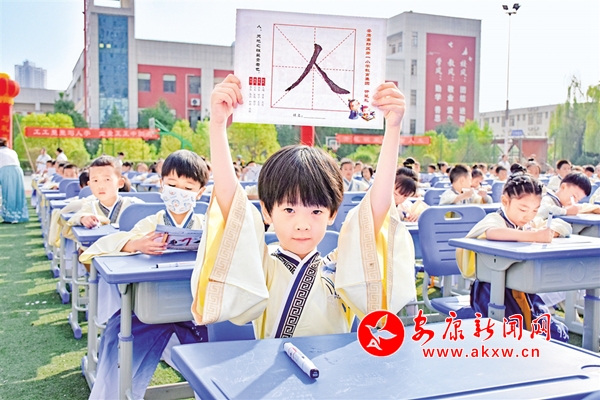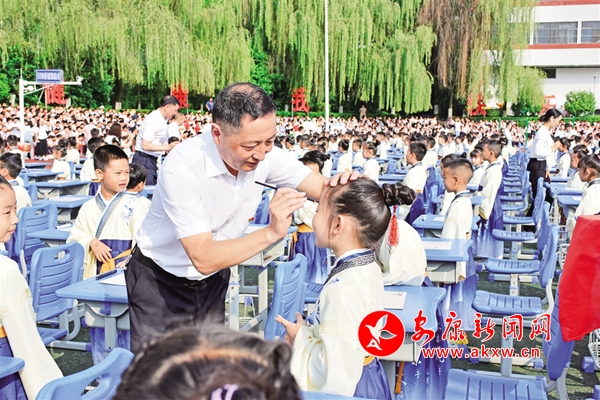 為傳承中國傳統(tǒng)文化,進一步加強學生文明禮儀教育,日前,安康高新區(qū)第一小學舉行一年級新生開筆禮及優(yōu)秀學生表彰活動。千名一年級蒙童身著漢服,由班主任帶領(lǐng)跨過啟蒙門,正衣冠、感恩鞠躬、朱砂啟智、擊鼓明志、開筆啟蒙,接受中國傳統(tǒng)文化的洗禮,領(lǐng)略傳統(tǒng)文化的魅力。(張凌云 攝)