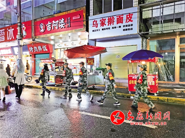 10月1日,志愿服務(wù)隊在中心城區(qū)培新街開展夜間巡邏。潘潤生 攝