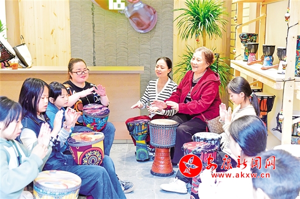 國慶期間,漢陰雙河口古鎮(zhèn)游客爆滿。圖為游客在古鎮(zhèn)手鼓店體驗打手鼓。陳浩 攝