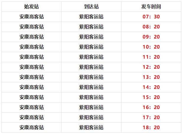 紫陽客運(yùn)站發(fā)往安康高速客運(yùn)站,每日12班,發(fā)車時(shí)間為: