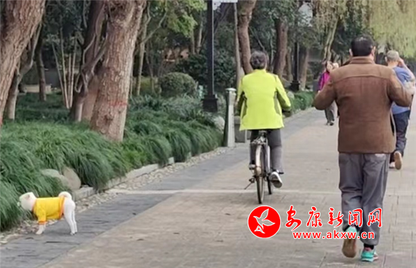 11月8日下午,金川街沿江步道有市民遛狗未牽繩。(圖文/馬歡)