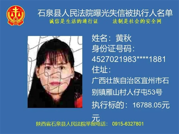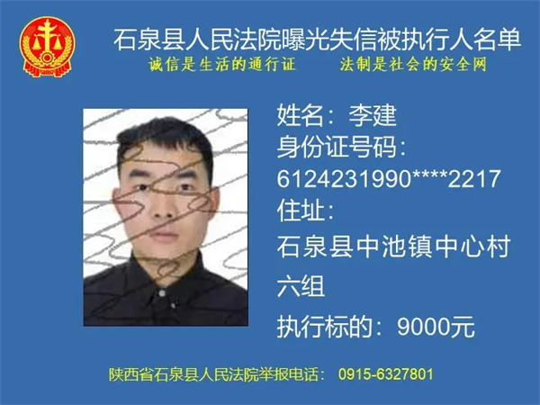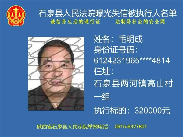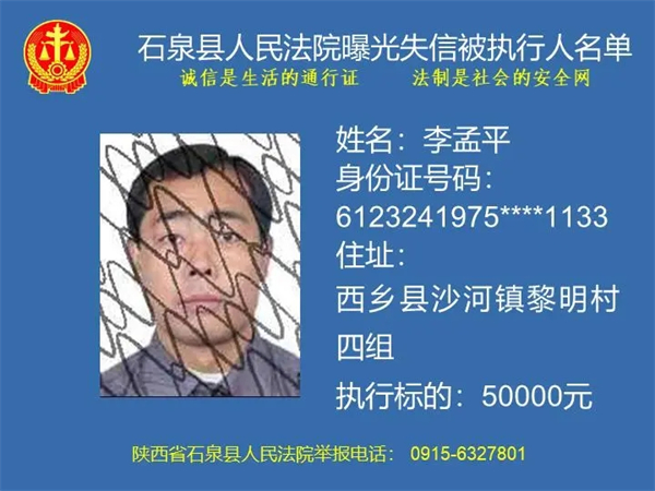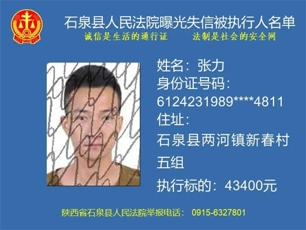 為了進(jìn)一步加大執(zhí)行力度,保障勝訴當(dāng)事人的合法權(quán)益,推進(jìn)社會(huì)誠信體系建設(shè),依照《中華人民共和國民事訴訟法》《最高人民法院關(guān)于公布失信被執(zhí)行人名單信息的若干規(guī)定》等法律、司法解釋的有關(guān)規(guī)定,現(xiàn)對一批已進(jìn)入執(zhí)行程序,且尚未全部履行義務(wù)的被執(zhí)行人進(jìn)行媒體曝光,歡迎廣大群眾支持石泉縣人民法院的工作,向我院提供被執(zhí)行人的財(cái)產(chǎn)線索,使生效法律文書能夠得到切實(shí)執(zhí)行,讓人民群眾切實(shí)感受到公平正義就在身邊。