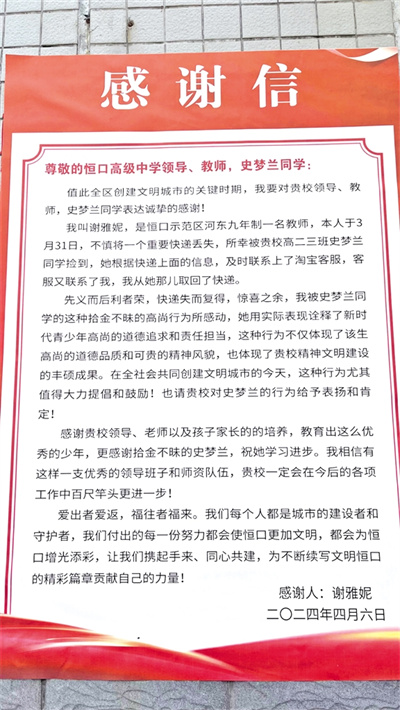 小城大愛,溫暖無處不在。近日,在恒口高級中學,河東九年制學校教師謝雅妮給該校學生史夢蘭送來了一封暖意融融的感謝信,向她拾金不昧的行為表示感謝,也為學校的德育工作點贊。