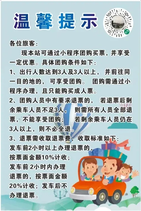 新增團(tuán)購(gòu)小程序,目前開啟安康——紫陽(yáng)團(tuán)購(gòu)票,紫陽(yáng)全程68公里,途經(jīng)包茂高速,運(yùn)行大約1小時(shí)。票價(jià)最低20元起,三人可成團(tuán),購(gòu)票更優(yōu)惠!下方圖片內(nèi)二維碼可快速購(gòu)買。