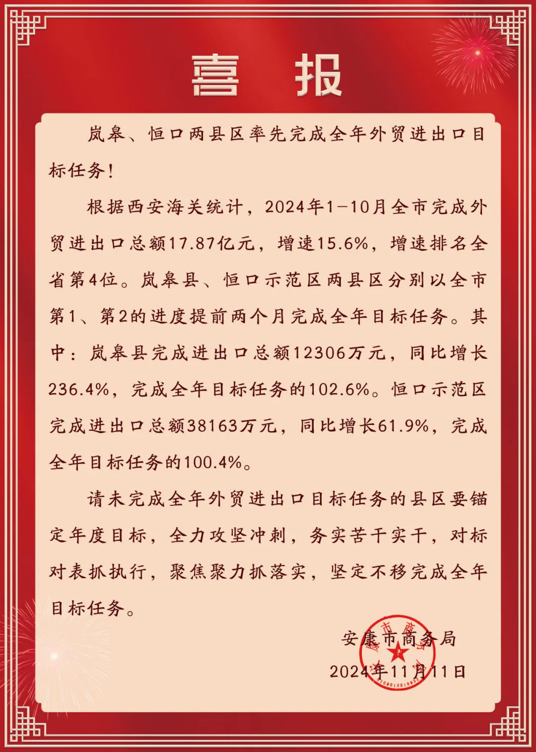 ?近日,市商務(wù)局發(fā)來喜報,恒口示范區(qū)率先完成全年外貿(mào)進出口目標任務(wù)。
