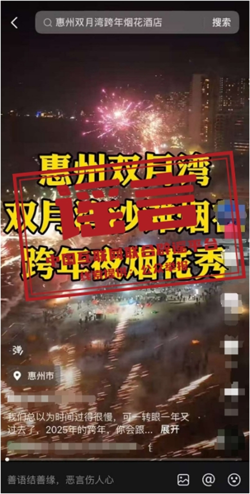 真相:近期,網(wǎng)絡(luò)上出現(xiàn) “廣東惠州雙月灣2025跨年煙花秀”“2025雙月灣跨年倒數(shù)夜”“雙月灣跨年煙花秀”等信息,引發(fā)關(guān)注。經(jīng)相關(guān)部門核實(shí),網(wǎng)傳信息均系不實(shí)信息。目前廣東省惠州市惠東縣雙月灣沒有舉辦2025年跨年煙花秀活動的安排,請廣大游客不聽謠、不信謠、不傳謠,一切以官方發(fā)布信息為準(zhǔn)。(來源:“惠州日報”微信公眾號、惠東文旅體)