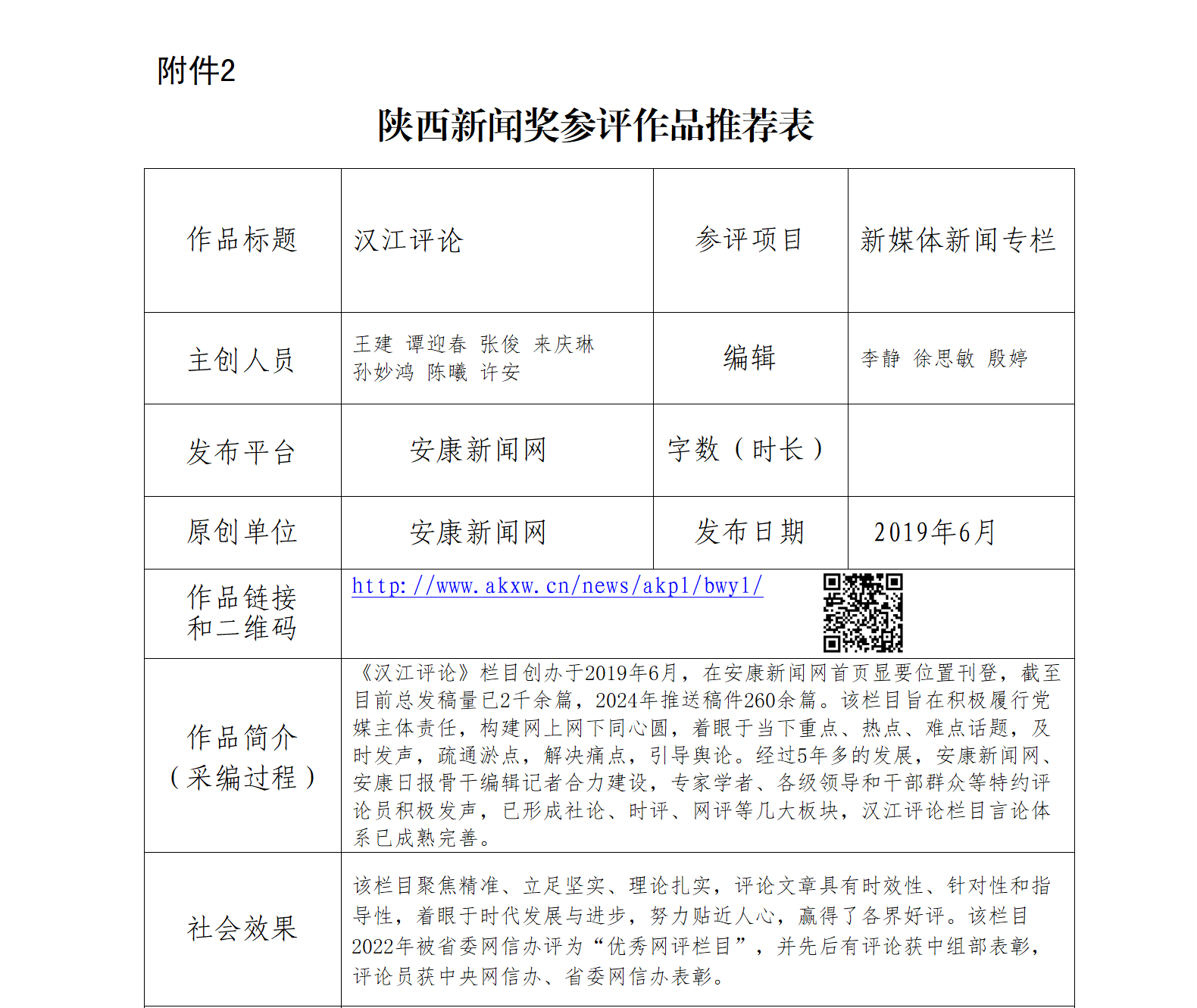 經(jīng)過社黨委研究決定,擬推薦以下2件新聞作品參評“2024年度陜西新聞獎融合報道、應(yīng)用創(chuàng)新和新媒體新聞專欄”。公示時間從2025年1月6日至2025年1月10日,公示期5個工作日。如有不同意見,請向安康日報社機(jī)關(guān)紀(jì)委、新聞管理部反映。