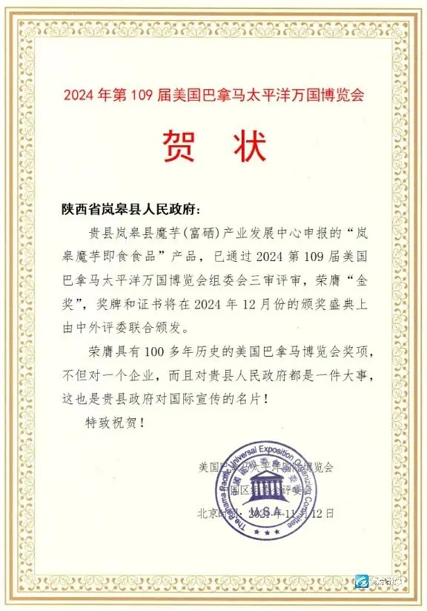 1月8日,筆者從泰國(guó)曼谷舉行的2024年第109屆美國(guó)巴拿馬太平洋萬(wàn)國(guó)博覽會(huì)頒獎(jiǎng)盛典上獲悉,由嵐皋縣魔芋產(chǎn)業(yè)發(fā)展中心申報(bào)的“嵐皋魔芋即食食品”,榮膺2024年第109屆美國(guó)巴拿馬太平洋萬(wàn)國(guó)博覽會(huì)“金獎(jiǎng)”。