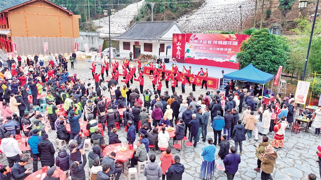據(jù)了解,為了準(zhǔn)備此次庖湯宴,去年12月底,石門鎮(zhèn)總投資120余萬元開始進(jìn)行橫溪古鎮(zhèn)舊房改造提升項(xiàng)目,著力打造“古鎮(zhèn)庖湯宴”品牌。經(jīng)過項(xiàng)目改造,古鎮(zhèn)完成全面升級。不僅如此,石門鎮(zhèn)政府還不斷通過“線上+線下”的宣傳方式,提升當(dāng)?shù)芈糜螛I(yè)影響力,積極制作旅游宣傳視頻,此次活動(dòng)帶動(dòng)引流2000人次。(柯明宇 攝)