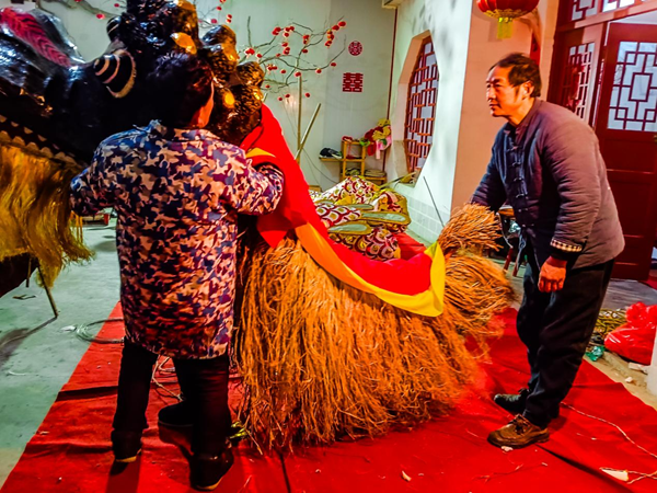 2月1日,大年初四,大家還沉浸在新年快樂中。喧天彩排鑼鼓一敲,嘹亮嗩吶一響,在雙河鎮(zhèn)政府的號召下,李忠寶帶著一群表演經(jīng)驗豐富的文藝骨干、朝氣蓬勃的青年學生,換上演出行頭,帶著自制的花燈道具,開始李氏花燈游演排練。在現(xiàn)場,彩色中國龍游動、翻滾、盤踞,不停地變換著花樣;獅子騰躍、回旋、直立,時而威風凜凜、時而憨態(tài)可掬……