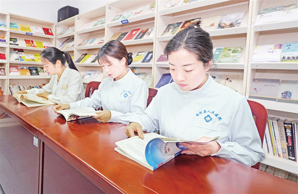4月23日,白河縣人民醫(yī)院護(hù)士利用工作間隙在圖書(shū)角專注閱讀。(伍渭康 攝)??