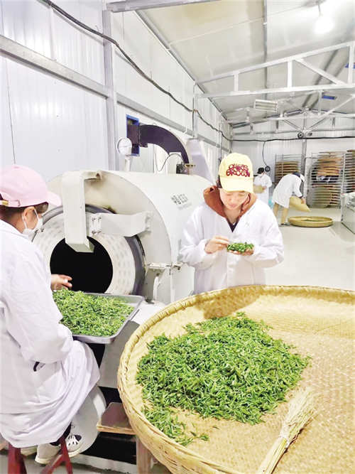 沿著九曲山路攀至絲鋪村五龍山,1200米的海拔高地,500畝生態(tài)茶園豁然舒展在眼前。茶農(nóng)們星羅棋布地穿梭在茶園,夏茶葉紛紛從茶樹間跌落?!案呱讲杌馗首?,這片云海就是天然保鮮庫?!贝逯Р繒洸碳椅妮p捻茶葉,陣陣清香沁人心脾。旬陽五龍山農(nóng)民種植專業(yè)合作社負(fù)責(zé)人王志富打開茶廠卷簾門,生產(chǎn)線熱氣蒸騰?!叭ツ晡覀兪召徚?000公斤鮮葉,加工了1000公斤干茶,產(chǎn)值達(dá)到30萬元,輻射帶動(dòng)周邊村民端穩(wěn)飯碗。”