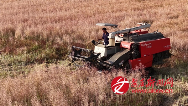 “我們有一臺(tái)直收的收割機(jī),還有兩臺(tái)分段收割的收割機(jī),比人工快多了,一畝田有個(gè)十幾分鐘就收完了?!币慌_(tái)新型現(xiàn)代化收割機(jī)在田間來(lái)回穿梭,田里的秸稈茬口整齊如梳,剛卸下的菜籽在陽(yáng)光下泛著油光。據(jù)了解,該合作社400畝示范基地全部采用機(jī)械化收割,起到了良好的示范推廣作用。
