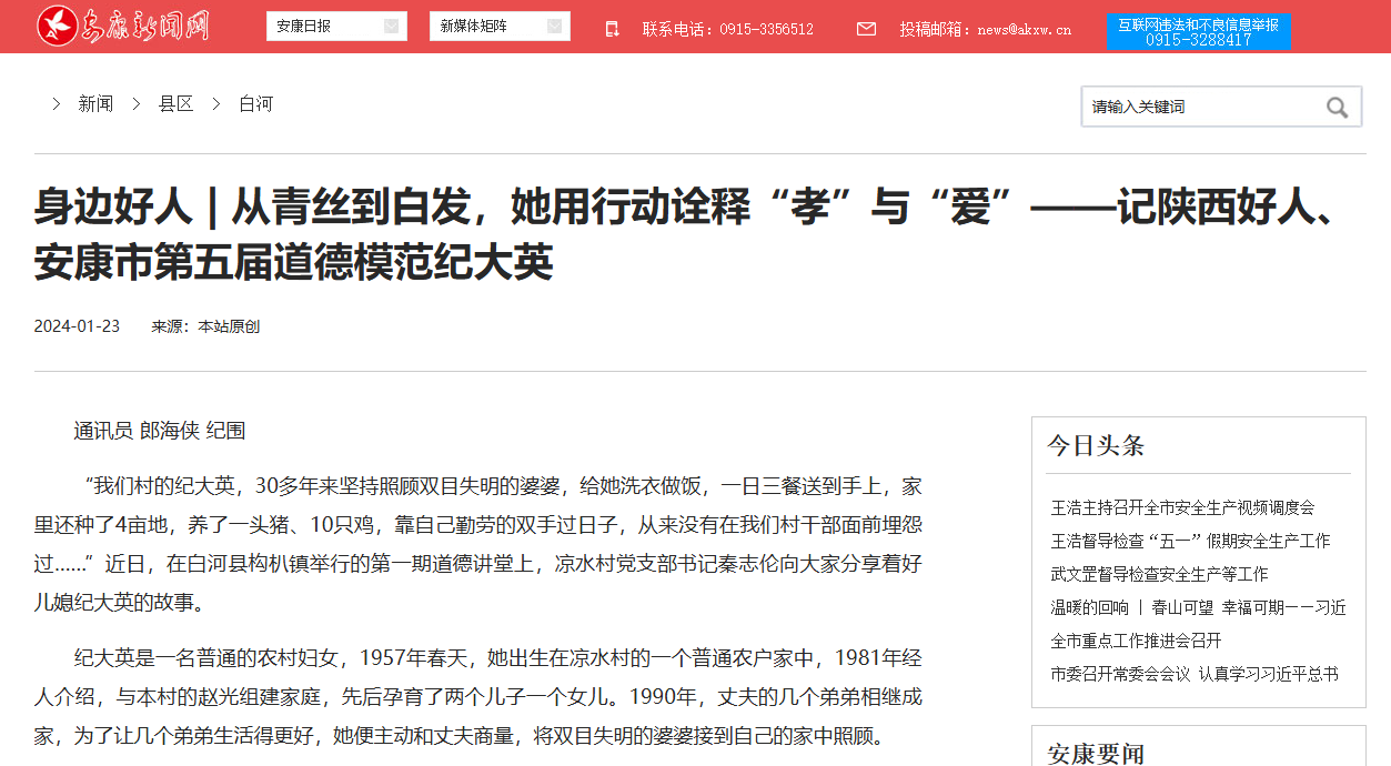 《身邊好人 | 從青絲到白發(fā),她用行動詮釋“孝”與“愛”——記陜西好人、安康市第五屆道德模范紀大英》(2024-01-23發(fā)布)