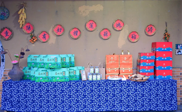 此外,活動現(xiàn)場精心打造了“重陽有好禮,蓮藕燉豬蹄”網(wǎng)紅墻,成為參會人員打卡留戀的熱門地點;同時,設置了農(nóng)副產(chǎn)品展銷區(qū),集中呈現(xiàn)紫陽蒸盆子、蒿坪河蓮藕、紫陽荷葉茶、蓮藕燉豬蹄等特色農(nóng)副產(chǎn)品。值得關注的是,硒園農(nóng)莊此次首次推出“蒿坪河蓮藕燉豬蹄”伴手禮盒,分為“四至五人份”和“八至十人份”兩種規(guī)格,于重陽節(jié)前夕上市。該禮盒將堂食菜品轉化為便攜商品,為當?shù)厣徟轰N售拓展了新渠道,也為蓮藕產(chǎn)業(yè)鏈延伸做了初步嘗試。