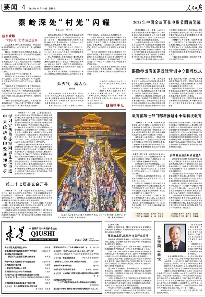 《秦嶺深處“村光”閃耀》一一寧陜村光大道專題報道11月16日在人民日報4版要聞頭條刊發(fā),并配發(fā)《煙火氣 動人心》編輯手記評論員文章。
