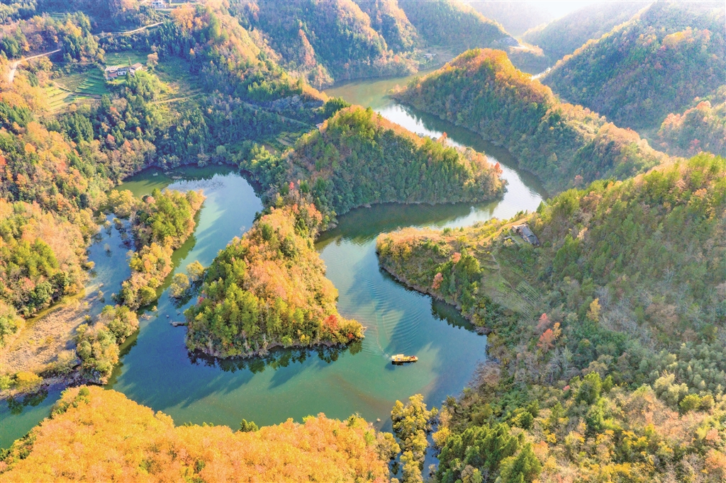 夕陽下的沙坪河,斑斕山林與澄澈水色繪就成一幅靈動(dòng)的水鄉(xiāng)畫卷。郭浩 攝