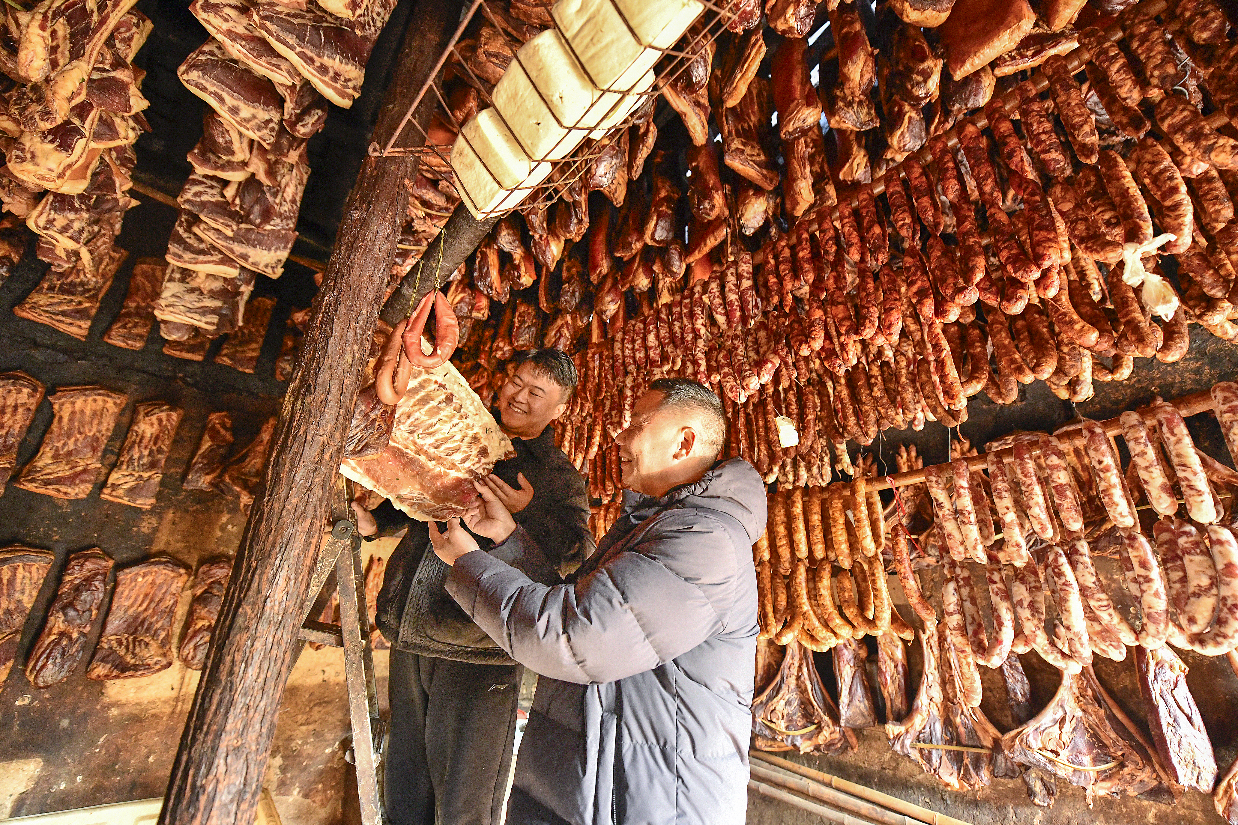 12月29日,走進石泉縣城關鎮(zhèn)珍珠河村王全勇家,臘肉、香腸整齊懸掛,紅亮油潤。近年來,珍珠河村以集體經(jīng)濟合作社牽頭,發(fā)動返鄉(xiāng)能人,在安全前提下,以古法烘制臘肉、香腸等特色“年貨”,年均出產(chǎn)臘肉6萬余斤,持續(xù)做強本土“臘味”經(jīng)濟,多渠道助農(nóng)增收。