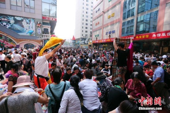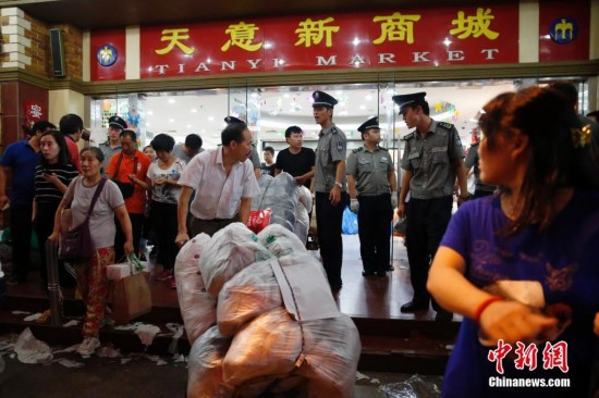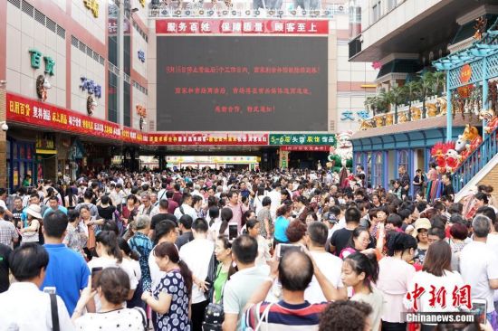 9月15日,商戶聚集在北京天意商城門口甩賣商品,吸引大批顧客搶購。天意商城是北京規(guī)模最大的小商品批發(fā)兼零售市場,為疏解北京非首都功能,天意商城將于9月16日關門停業(yè)。中新社記者 盛佳鵬 攝