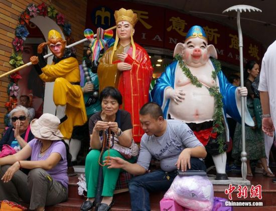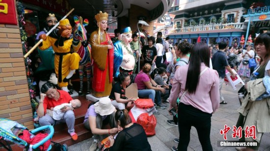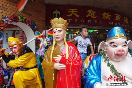 9月15日,一孩童坐在天意門前西游記師徒雕像上遠眺。當日,自1992年開業(yè)至今的北京天意市場迎來其在北京西城阜外大街營業(yè)的最后一日,商家趁機“瘋狂甩貨”,大批北京民眾也紛至沓來。這里曾是北京著名的小商品商城,聚集了數(shù)千家商戶。為疏解北京非首都功能,天意商城將于本月16日關門停業(yè)。中新社記者 崔楠 攝