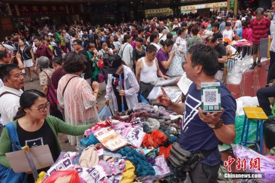 9月15日,天意商戶舉起二維碼方便顧客掃碼支付,以新式支付方式助力傳統(tǒng)零售。當日,自1992年開業(yè)至今的北京天意市場迎來其在北京西城阜外大街營業(yè)的最后一日,商家趁機“瘋狂甩貨”,大批北京民眾也紛至沓來。這里曾是北京著名的小商品商城,聚集了數(shù)千家商戶。為疏解北京非首都功能,天意商城將于本月16日關門停業(yè)。中新社記者 崔楠 攝