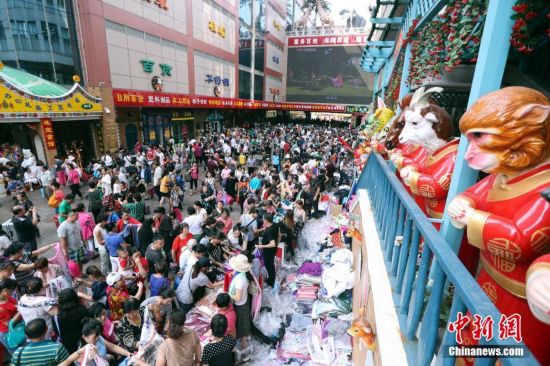 9月15日,商戶在北京天意商城甩賣商品,吸引大批顧客搶購。天意商城是北京規(guī)模最大的小商品批發(fā)兼零售市場,為疏解北京非首都功能,天意商城將于9月16日關門停業(yè)。中新社記者 盛佳鵬 攝