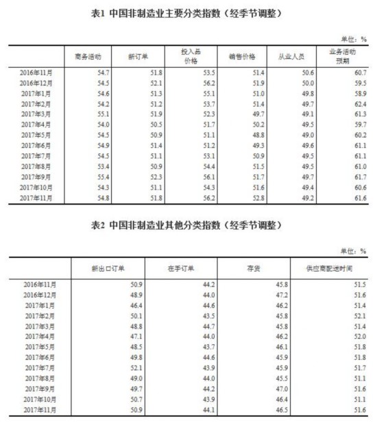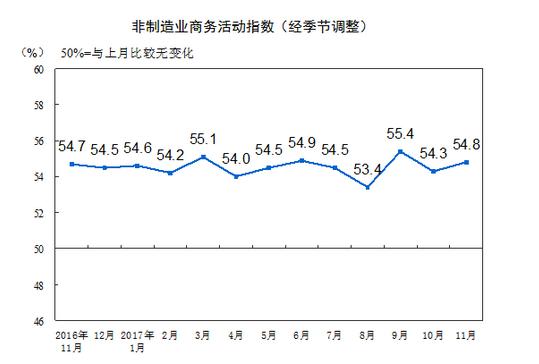 人民網(wǎng)北京11月30日電 據(jù)國家統(tǒng)計(jì)局網(wǎng)站消息,2017年11月份,中國非制造業(yè)商務(wù)活動指數(shù)為54.8%,比上月上升0.5個(gè)百分點(diǎn),持續(xù)位于擴(kuò)張區(qū)間,非制造業(yè)延續(xù)平穩(wěn)較快的增長態(tài)勢,增速有所加快。