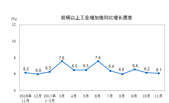 人民網北京12月14日電(記者李楠樺)據國家統(tǒng)計局官方網站消息,2017年11月份,規(guī)模以上工業(yè)增加值同比實際增長6.1%(以下增加值增速均為扣除價格因素的實際增長率),比10月份回落0.1個百分點。從環(huán)比看,11月份,規(guī)模以上工業(yè)增加值比上月增長0.48%。1-11月份,規(guī)模以上工業(yè)增加值同比增長6.6%。