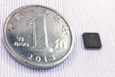 | 2017年9月16日,全球首個支持新一代北斗三號信號體制的高精度導(dǎo)航定位芯片正式發(fā)布。圖為支持新一代北斗三號信號體制的高精度導(dǎo)航定位芯片與1角硬幣的對比照片。 |