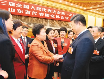 | 3月8日,中共中央總書記、國家主席、中央軍委主席習近平參加十三屆全國人大一次會議山東代表團的審議。在“三八”國際勞動婦女節(jié)到來之際,習近平代表黨中央,向參加全國兩會的女代表、女委員、女工作人員,向全國各族各界婦女同胞,致以節(jié)日的祝賀和誠摯的祝福。圖為習近平同女代表親切交談。 |