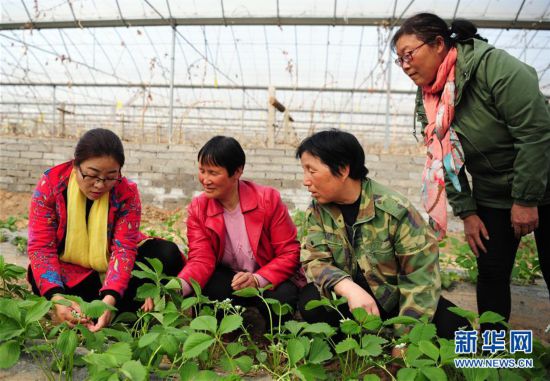 楊育英(左一)在自家果蔬大棚內(nèi)與員工交流育苗技術(shù)(3月20日攝),F(xiàn)年45歲的楊育英早前并不從事農(nóng)業(yè)。她19歲開始到北京打工,先是做推銷員,后來專門從事設(shè)施農(nóng)業(yè)設(shè)備的生產(chǎn)?吹皆O(shè)施農(nóng)業(yè)前景廣闊,她2008年帶著技術(shù)和資金回到陜西渭南老家,搞起了葡萄種植。建大棚、配設(shè)施、引苗木,很快她就建起了渭南裕美現(xiàn)代農(nóng)業(yè)設(shè)施示范園,并先后引進(jìn)了36個葡萄品種。問起成功的秘訣,她坦言得益于她的“朋友圈”。新華社發(fā)(張博文 攝)