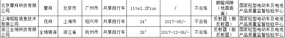 2017年共享自行車產品質量國家監(jiān)督專項抽查不合格產品及其企業(yè)名單(來源:國家質檢總局)