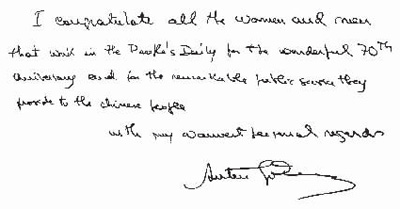 6月15日,人民日?qǐng)?bào)將迎來(lái)創(chuàng)刊70周年紀(jì)念。當(dāng)?shù)孟と嗣袢請(qǐng)?bào)、人民網(wǎng)、人民日?qǐng)?bào)“兩微兩端”等全媒體平臺(tái)超過(guò)7億的受眾,將通過(guò)文字和視頻分享他的見(jiàn)解時(shí),古特雷斯非常開(kāi)心,“這是我所見(jiàn)過(guò)的最大平臺(tái)了”。他欣然為人民日?qǐng)?bào)題詞:“謹(jǐn)向人民日?qǐng)?bào)創(chuàng)刊70周年致以最熱忱的祝賀。感謝貴報(bào)全體員工為中國(guó)人民提供的卓越服務(wù)!保ㄈ鐖D二)