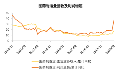 來到2018年一季度前兩月,行業(yè)加速改善態(tài)勢更為明顯。醫(yī)藥制造業(yè)主營業(yè)務(wù)收入同比增長18.3%,利潤總額累計值同比增長37.3%,遠(yuǎn)超去年同期,劉可認(rèn)為,這表明行業(yè)整體環(huán)境在持續(xù)有效改善。