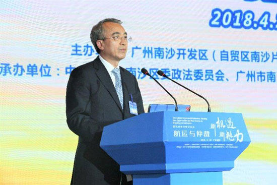 在“航運與仲裁 新機(jī)遇 新魅力”國際仲裁交流活動上,廣州市委常委、南沙區(qū)委書記蔡朝林致辭推介南沙。
