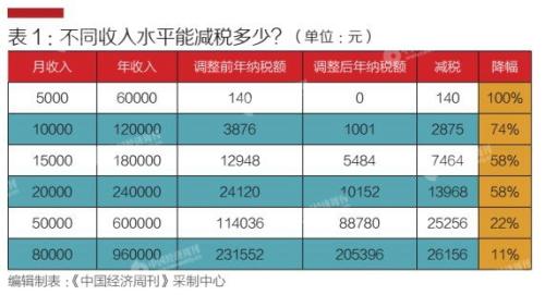 總體而言,月收入5000元以下的納稅人將不需要繳納個稅,稅負(fù)降幅為100%,月收入為8萬元的納稅人,年納稅額的降幅超過10%。