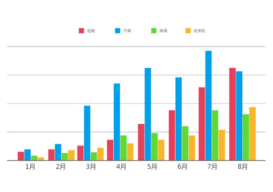 數(shù)據(jù)顯示,相較于1月,8月份凈水器在全國(guó)零售云店的銷量增長(zhǎng)1390%,洗碗機(jī)增長(zhǎng)1300%,掃地機(jī)器人增長(zhǎng)573%,吸塵器增長(zhǎng)490%,單反相機(jī)增長(zhǎng)400%。