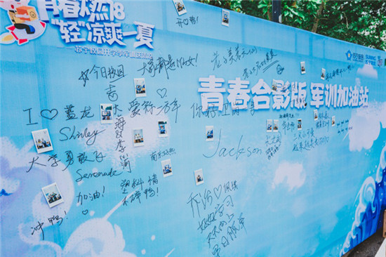 據(jù)介紹,本次蘇寧軍訓(xùn)送清涼活動南農(nóng)站現(xiàn)場,還特別設(shè)置了“青春合影版 軍訓(xùn)加友站“活動,為軍訓(xùn)新生們紀念軍訓(xùn)的英姿,F(xiàn)場所有領(lǐng)取了清涼禮包的同學(xué),可以與身邊好友一起,使用蘇寧校園提供的拍立得合照并將照片貼上展板。