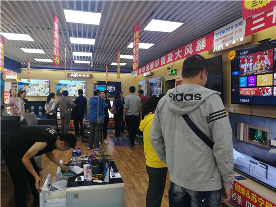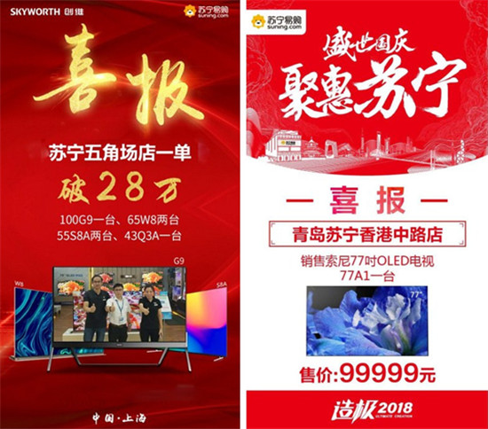 消費(fèi)升級(jí)趨勢(shì)下,越來(lái)越多的消費(fèi)者傾向于購(gòu)買提升品質(zhì)生活的家電產(chǎn)品。而彩電作為客廳娛樂(lè)的重頭戲,表現(xiàn)尤其明顯。代表未來(lái)顯示技術(shù)的OLED電視,QLED量子點(diǎn)電視在這個(gè)國(guó)慶,都受到了消費(fèi)者的熱烈追捧。上海蘇寧五角廣場(chǎng)店開出了一筆超28萬(wàn)元的彩電大單,客戶顧先生一口氣買下了188888元的創(chuàng)維百吋電視100G9、39999元的創(chuàng)維OLED電視65W8、11999元的創(chuàng)維OLED電視55S8A及創(chuàng)維43Q3A共計(jì)四臺(tái)電視。青島香港中路店則售出了售價(jià)99999元的索尼OLED電視77A1。