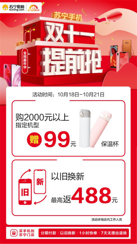 本次蘇寧手機“雙十一提前搶”活動,主要針對以舊換新業(yè)務(wù),活動期間在蘇寧易購門店通過以舊換新購買新機,最高可返488元,同時購買2000元以上的指定機型,還可獲得獲贈保溫杯等各種禮品。
