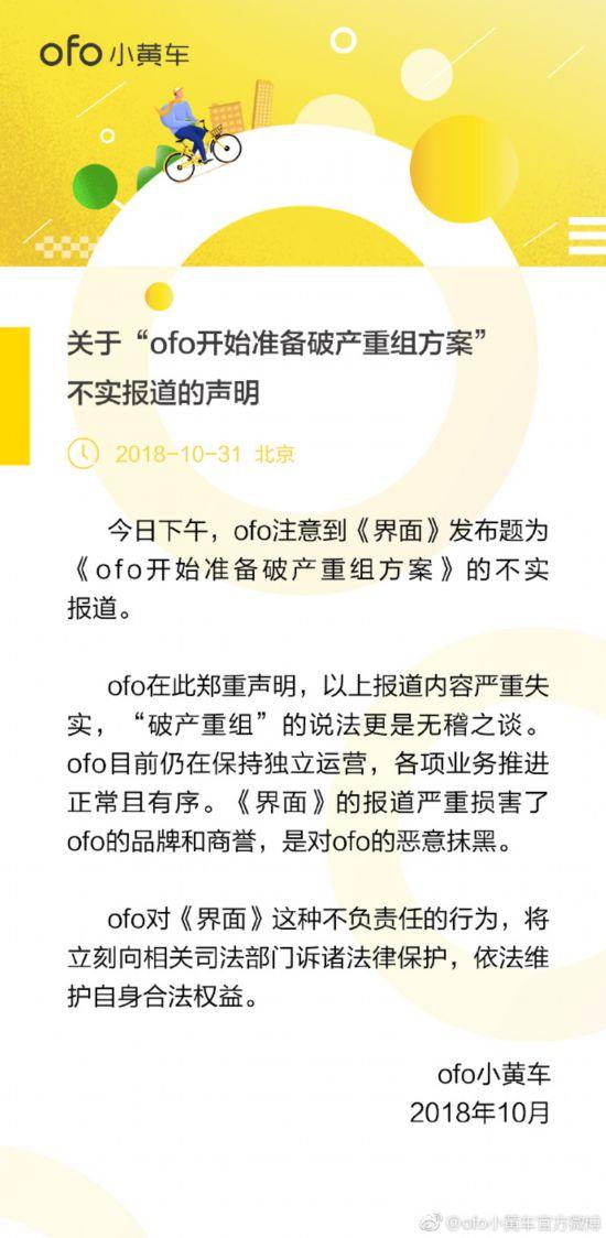 31日下午,ofo在官方微博發(fā)布一份聲明,稱此前媒體報(bào)道的“ofo開始準(zhǔn)備破產(chǎn)重組方案”的說法是無稽之談,ofo將立刻訴諸法律保護(hù),維護(hù)自身合法權(quán)益。