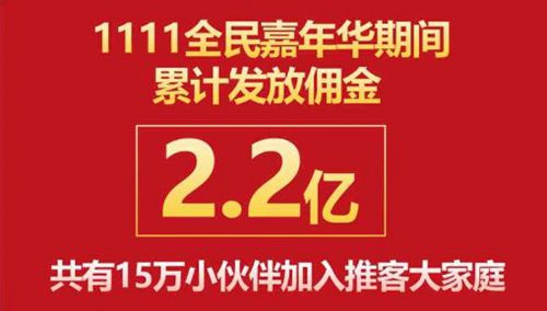 尤其是全民嘉年華超級(jí)現(xiàn)金獎(jiǎng)勵(lì)(全平臺(tái)訂單每單都有定額現(xiàn)金補(bǔ)貼,最高每單4元,單數(shù)上不封頂)極大激發(fā)了推客們的熱情,為此蘇寧推客“大出血”整個(gè)雙十一期間累計(jì)發(fā)放2.2億傭金獎(jiǎng)勵(lì),新增用戶15萬(wàn)。